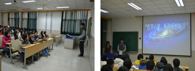 为使同学们感受班集体的温暖,享受愉快的大学生活,资源与环境学院地科1302班和地科1303班于11月22日晚在十教103举办了精彩有趣的心理健康主题班会。